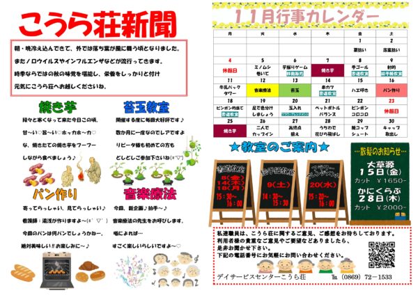 【事業所案内】デイサービスセンターこうら荘 行事表(11月度)更新しました