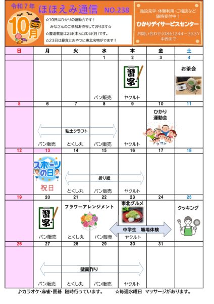 【事業所案内】ひかりデイサービスセンター 行事表(10月度)更新しました