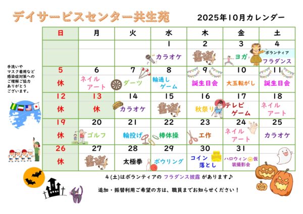 【事業所案内】デイサービスセンター共生苑 行事表(10月度)更新しました