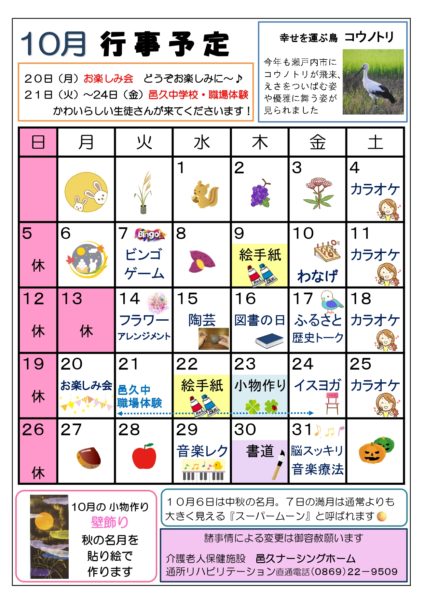 【事業所案内】邑久ナーシングホーム通所リハビリテーション 行事表(10月度)更新しました