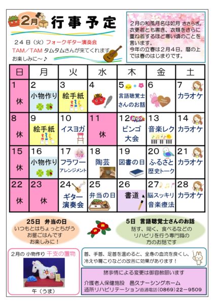 【事業所案内】邑久ナーシングホーム通所リハビリテーション 行事表(2月度)更新しました