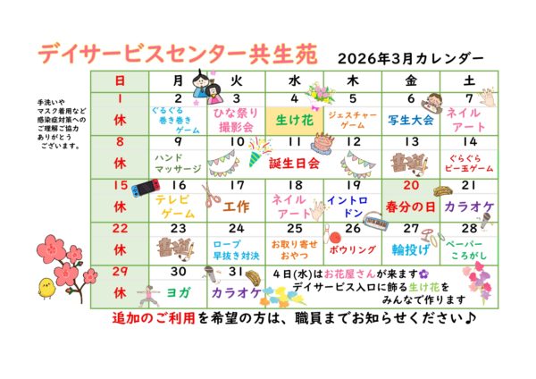 【事業所案内】デイサービスセンター共生苑 行事表(3月度)更新しました