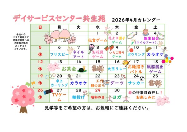 【事業所案内】デイサービスセンター共生苑 行事表(4月度)更新しました