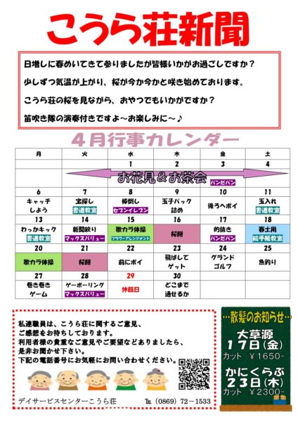 【事業所案内】デイサービスセンターこうら荘 行事表(4月度)更新しました
