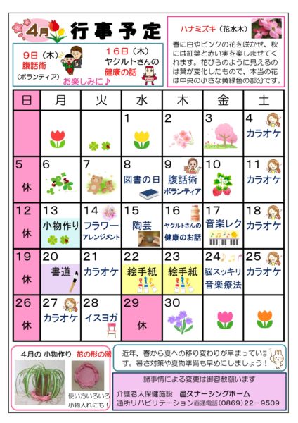 【事業所案内】邑久ナーシングホーム通所リハビリテーション 行事表(4月度)更新しました
